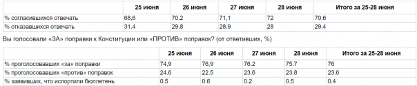 По данным экзитпола ВЦИОМ за четыре дня голосования, поправки в Основной закон страны поддержали 76,0% опрошенных. Против высказались 23,6%.Опрос проводился на 800 избирательных участков в 25 субъектах РФ. На выходе с избирательного участка интервьюеры ВЦИОМ предлагали пройти анонимный опрос. Задавался вопрос о том, как проголосовал респондент – «За» или «Против» поправок в Конституцию Российской Федерации.