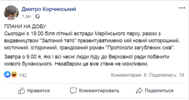 Об этом Корчинский написал в соцсети, призывая единомышленников выйти на акцию протеста к Верховной Раде из-за законопроекта Максима Бужанского, который подразумевает отсрочку тотальной украинизации школ.