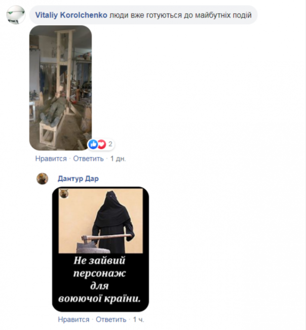 Единомышленник Корчинского Vitaliy Korolchenko в комментариях добавил, что побратимы «уже готовятся к будущим событиям», приложив фото с гильотиной. Источник