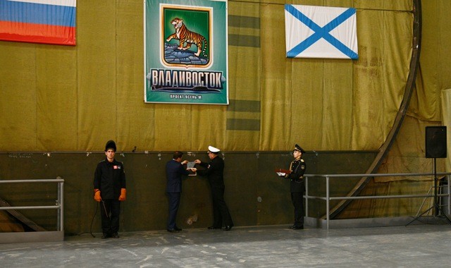 Командующий Северным флотом ВМФ России вице-адмирал Александр Моисеев и врио губернатора Архангельской области Александр Цыбульский на секциях АПЛ установили закладные доски. Почетное право проведения сварочных работ было предоставлено электросварщикам Севмаша Юрию Коробову и Николаю Панасенко.