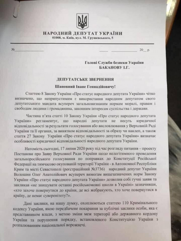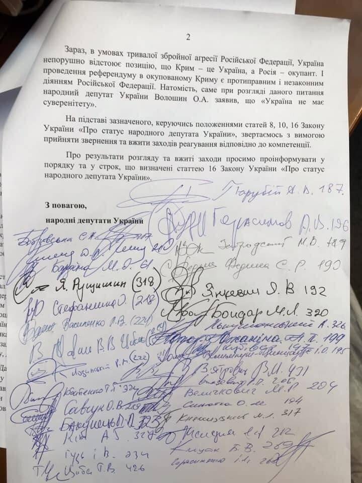 «Сейчас, в условиях длительной вооруженной агрессии Российской Федерации, Украина неподвижно отстаивает позицию, что Крым – это Украина, а Россия – оккупант. И проведение референдума в оккупированном Крыму является противоправным и незаконным деянием Российской Федерации. Зато, именно при рассмотрении данного вопроса народный депутат Украина Волошин О.А. заявил, что "Украина не имеет суверенитета», – подчеркивается в обращении.