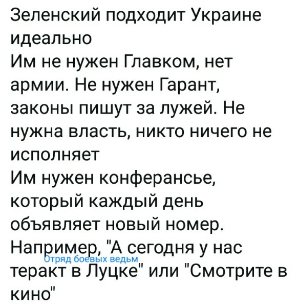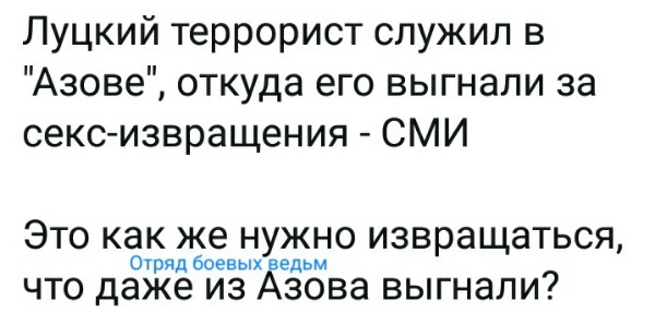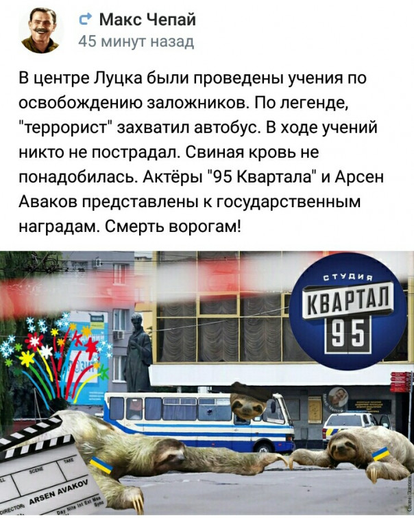«Полтавская антитеррористическая операция блестяще завершена. Ну как блестяще... Полковника-заложника "ветеран АТО" отпустил. Это раз. Зеленскому в очередной раз не пришлось трахать свинью. Это два. А сам террорист благополучно смотался в лес. Вместе с гранатой... А Арсен не спешит возглавить спецоперацию. Ну, тут всё серьёзно: полный псих, книг не пишет, тупо на наркоте сидит. Да ещё и в АТО воевал», — язвительно прокомментировал ситуацию киевский журналист Александр Зубченко. Источник