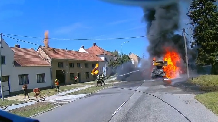 Двое пожарных пострадали при тушении автокрана, вспыхнувшего на дороге в населенном пункте Козланы, расположенном в восточной части Чехии.