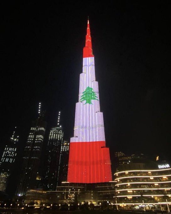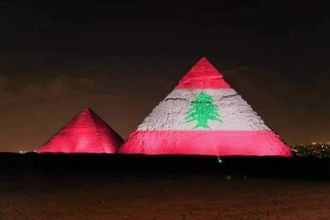 Египет. Бурдж-Халифа и Великие пирамиды Гизы окрасились в цвета Ливана после страшного взрыва в Бейруте