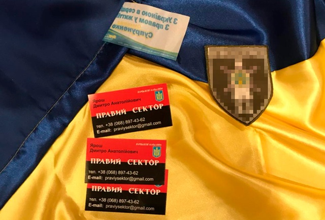 Как пишет «Лента.ру», ссылаясь на источник в правоохранительных органах, у членов организации во время обыска обнаружили визитки экс-главы «Правого сектора» Дмитрия Яроша. Кроме визиток Яроша на фото запечатлен арсенал, состоящий из огнестрельного и травматического оружия.