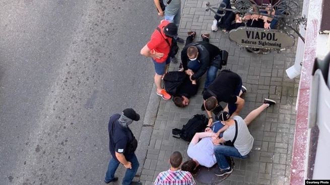 По сообщению на сайте "Дождя", журналистов задержали после разговора на улице с представительницей штаба незарегистрированного кандидата Виктора Бабарико, соратницей кандидата Светланы Тихановской Марией Колесниковой.