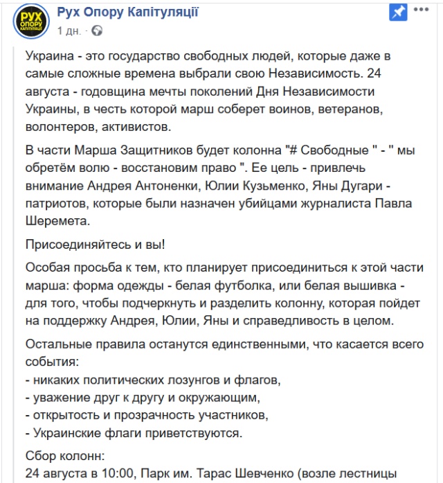 Близкий к Порошенко «Рух опору капитуляции» призывает сторонников выходить на марш 24 августа в белых футболках с надписью #FreeRiff #FreeAntonenko и фото подозреваемых в убийстве журналиста Павла Шеремета, которые собираются раздавать в парке Шевченко перед маршем.