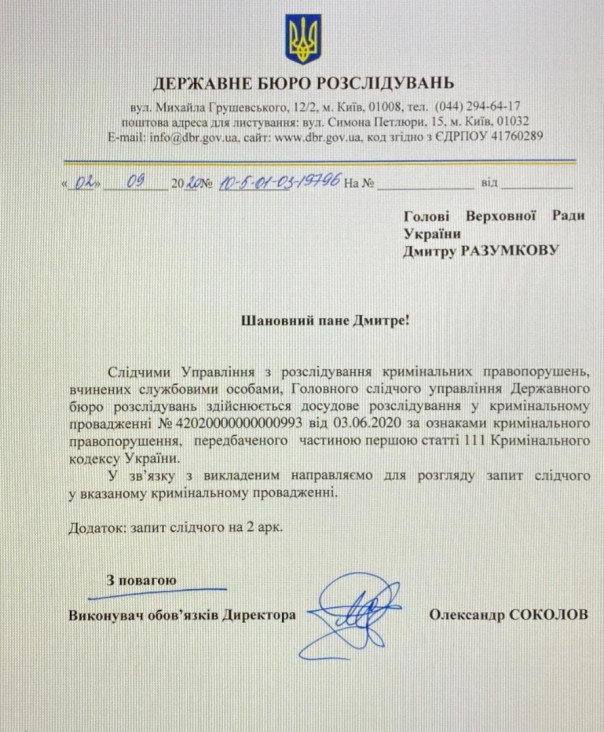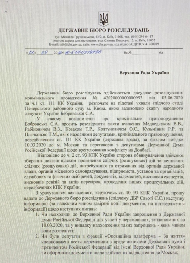 Дело открыто по заявлению депутата от партии «Голос» Соломии Бобровской, в котором говорится о визите в марте 2020 года депутатов от ОПЗЖ Виктора Медведчука, Рената Кузьмина, Александра Колтуновича, Татьяны Плачковой, Вадима Рабиновича в Москву, с целью переговоров в Госдуме РФ.