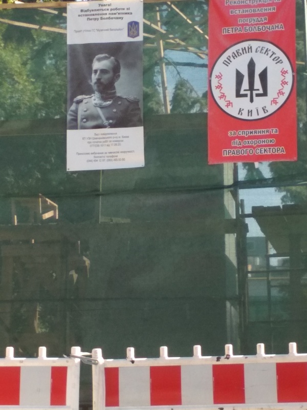 Согласно информации, которой обклеена отгороженная территория, националисты планируют установить бюст этнического молдаванина, офицера императорской армии, после революции ставшего убежденным украинским националистом, который был расстрелян в 1919 году по приказу Симона Петлюры, Петра Болбочана.