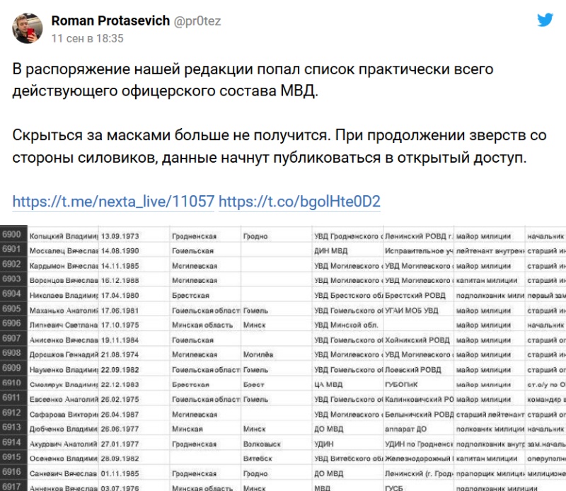 Также они предупредили, что передали админам ТГ-канала Nexta базы сотрудников МВД, ОМОН и КГБ. Редактор телеграм-канала Nexta Роман Протасевич подтвердил, что в его распоряжении имеются данные списки.