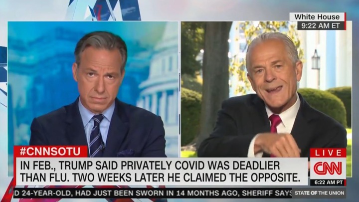 Таппер поинтересовался у помощника Трампа, почему хозяин Белого дома "лгал об опасности коронавируса", в ответ Наварро начал рассказывать о мерах, которые предпринимала президентская администрация по борьбе с вирусом. Наварро заступился за президента и его действия, сославшись на противоположные точки зрения экспертов-вирусологов. Президент был абсолютно прав в том, что не хотел запугивать население, считает он.