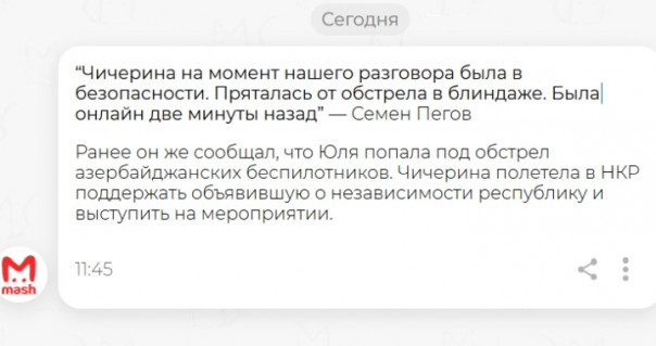 «Чичерина на момент нашего разговора была в безопасности. Пряталась от обстрела в блиндаже. Была онлайн две минуты назад», — добавил Пегов.