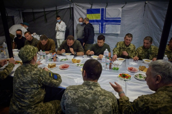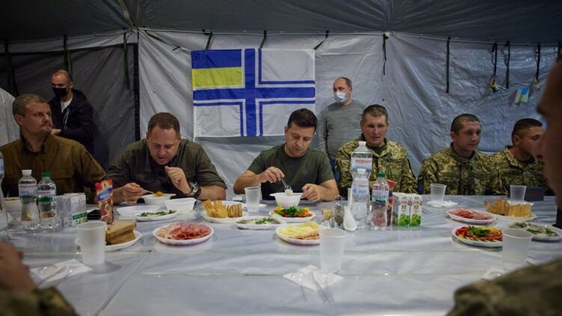 Пресс-служба Офиса президента выложила фото, на котором во время визита в зону военного конфликта в Донбассе Владимир Зеленский и глава ОП Андрей Ермак пообедали с украинскими военными.