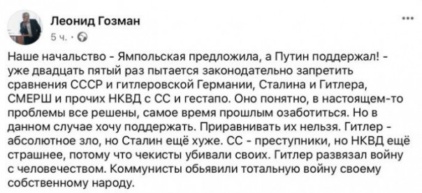 27 октября в ходе заседания Совета при Президенте РФ по культуре и искусству Владимир Путин поддержал идею усиления законодательных мер, запрещающих публичное сравнение/отождествление действий СССР и фашистской Германии во время Великой Отечественной войны. "Нам сам Бог велел включать соответствующие механизмы для защиты совсем недавнего прошлого", - констатировал он.