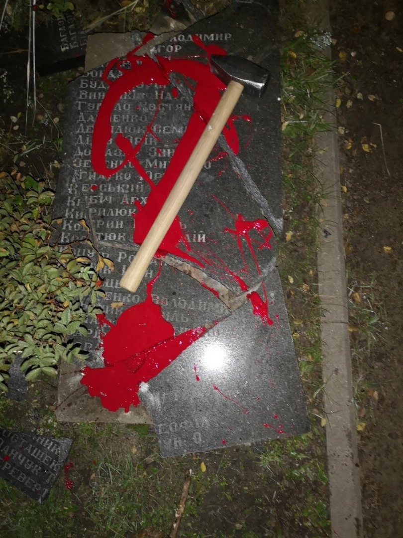Из фото следует, что гранитная плита, на которой выгравированы фамилии националистов, разбита. Сверху неизвестные разместили молоток и разлили кровавую краску.