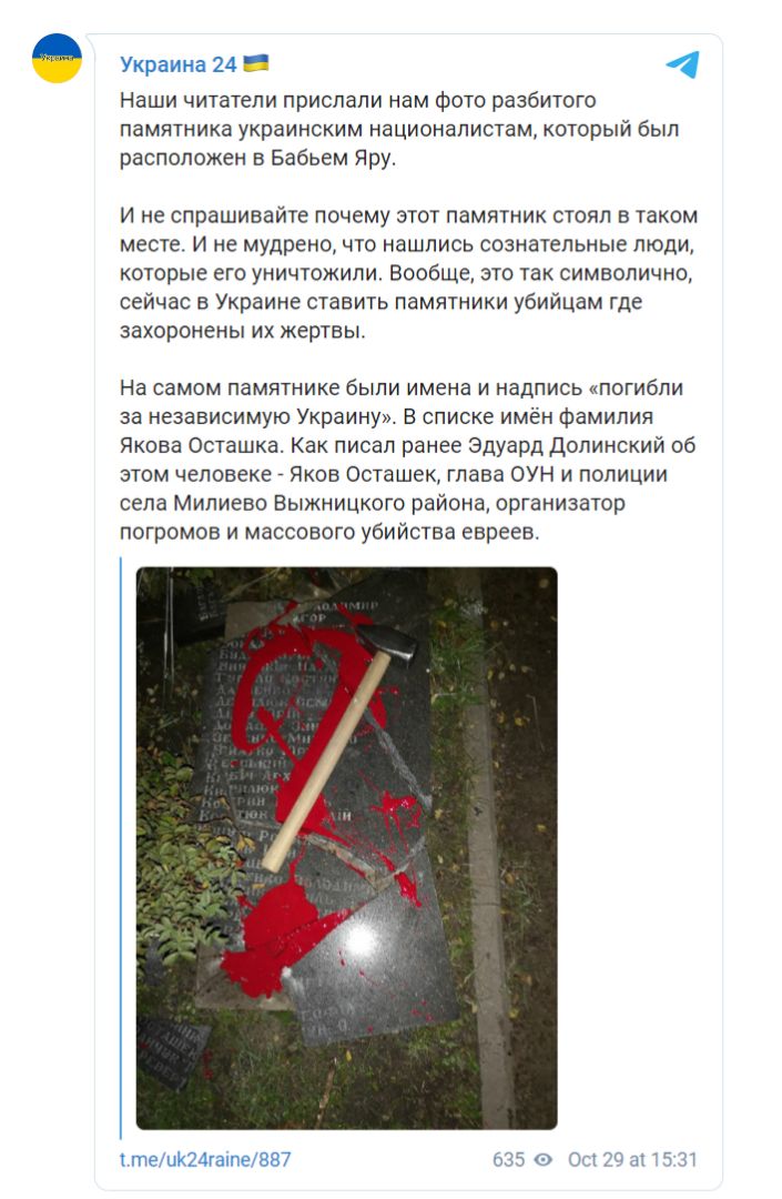 «На самом памятнике были имена и надпись „Погибли за независимую Украину‟. В списке имён — фамилия Якова Осташека. Как писал ранее Эдуард Долинский об этом человеке, Яков Осташек — глава ОУН и полиции села Милиево Выжницкого района, организатор погромов и массового убийства евреев», — говорится в заметке.