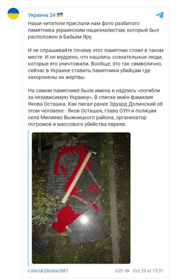 Напомним, Бабий Яр — скорбное место Киева, где в годы оккупации города нацистами были расстреляны сотни тысяч людей. Расстрелы во много осуществляли вспомогавшие немецкой армии формирования украинских националистов. Их наследники в настоящее время не стесняются утверждать, что это неправда, и заявляют, что националистов также расстреливали в Бабьем Яру. Такие случаи, возможно, и встречались, однако, расстреливали их за проступки перед немецкими хозяевами, в чём нет ничего экстраординарного, ведь нацисты расстреливали и своих соотечественников за нарушение своих предписаний. Примечательно, что и действующие украинские политики в памятные дни старательно избегают упоминания о том, что палачами в Бабьем Яру выступали украинские националисты.