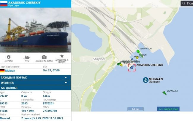 Пройдя ходовые испытания, трубоукладчик «Академик Черский» вернулся в немецкий Мукран. Следующей точкой судна может быть уже сам недостроенный участок газопровода, который расположен в нескольких десятках километров от порта.