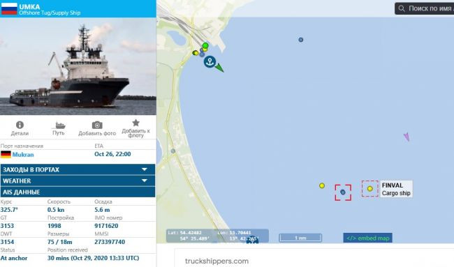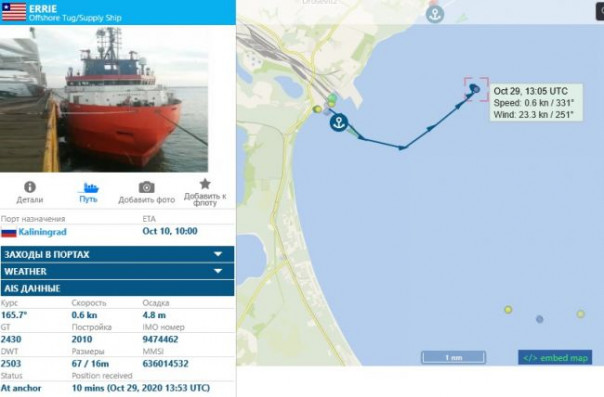 Также рядом с Мукраном находится и судно снабжения Errie, которое в октябре совершило пять рейсов между немецким портом и Калининградом. В Мукране оно освободило причал, после чего «Академик Черский» и занял свое место.