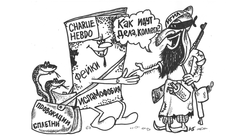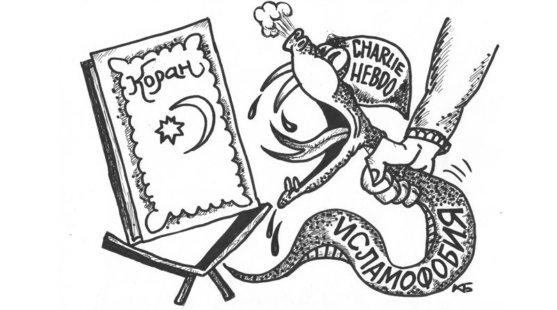 Во вторник республиканская общественно-политическая газета "Вести республики" опубликовала в инстаграме карикатуры. На одной из них изображена змея, символизирующая журнал Charlie Hebdo. Она выпускает яд на Коран. На другой карикатуре изображен боевик с черной повязкой на голове. Он пожимает руку журналу, на котором написано "фейки" и "исламофобия".