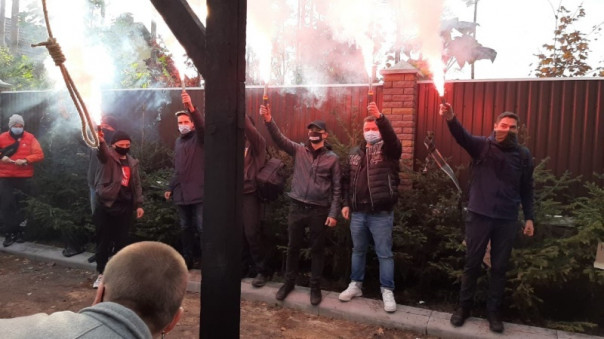 Радикалы пришли протестовать под дом главы Конституционного суда Украины Александра Тупицкого. Антураж привычен: фаеры, лозунги «слава Украине», полиция. Из нового креатива — виселица.