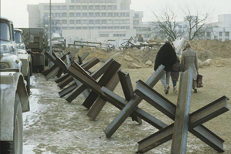 Противотанковые ежи на подходах к зданию парламента в Вильнюсе. 18 января 1991