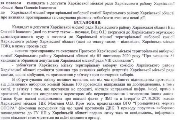 А началось всё так. Проигравший кандидат в депутаты городского совета от «Слуги народа» Алексей Вац обратился в Харьковский окружной административный суд с иском, в котором просил признать противоправным и отменить протокол ГИК «О признании 84 кандидатов избранными депутатами Харьковского городского совета VIII созыва» и обязать избирательную комиссию признать выборы несостоявшимися и назначить повторные. То есть оставить город без избранной власти.