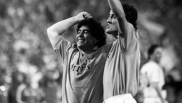 Rückspiel UEFA Cup Finale 1988/1989 in Stuttgart, Diego Armando Maradona und Ciro Ferarra (beide SSC Neapel) jubeln....Return match UEFA Cup Final 1988 1989 in Stuttgart Diego Armando Maradona and Ciro both SSC Naples cheer