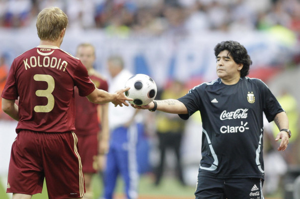 Главный тренер сборной Аргентины Диего Марадона с игроком сборной России Денисом Колодиным во время товарищеского футбольного матча между сборными командами России и Аргентины