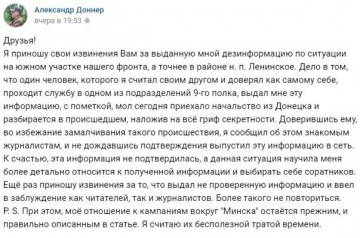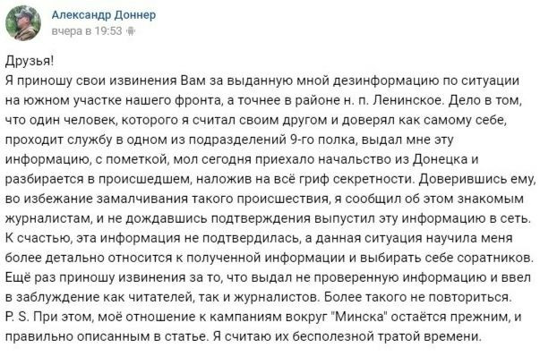 Друзья! Я приношу свои извинения за выданную мной информацию по ситуации на южном участке нашего фронта, а точнее в р-не н.п. Ленинское. Дело в том, что один человек, которого я считал своим другом и доверял как самому себе...