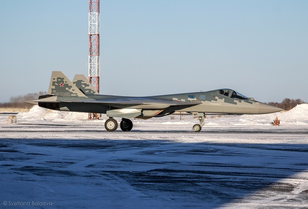 Первый (фактически второй) построенный серийный образец истребителя пятого поколения Су-57 с бортовым номером "01 синий" (самолет Т-50С-2, серийный номер 51002) во время промежуточной посадки в Толмачево (Новосибирск), 25.12.2020 (с) Светлана Балаева
