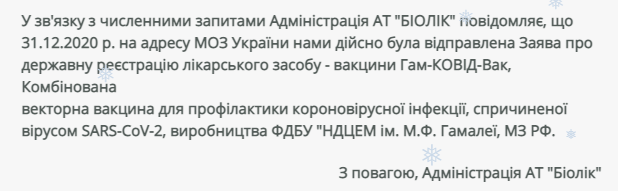 2 января лидер «Оппозиционной платформы – За жизнь» Виктор Медведчук сообщил о подаче российской вакцины от COVID-19 на регистрацию в Украине. При этом он упомянул, что этим вопросом занялась компания «Биолек».