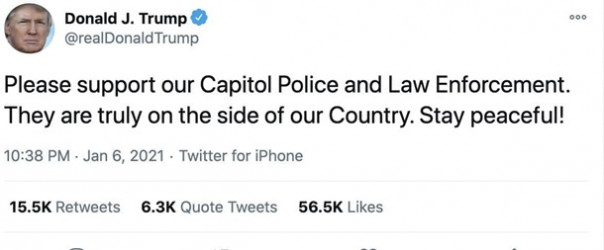 Тем временем Трамп опубликовал в своем Twitter сообщение, в котором призвал своих сторонников действовать мирно.