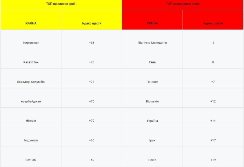 Украина демонстрирует резкое падение индекса счастья по сравнению с прошлым годом. 2020 год показал увеличение процента несчастливых украинцев по сравнению с 2019 годом почти вдвое: в 2019 — 33%, в 2020 — 14%.