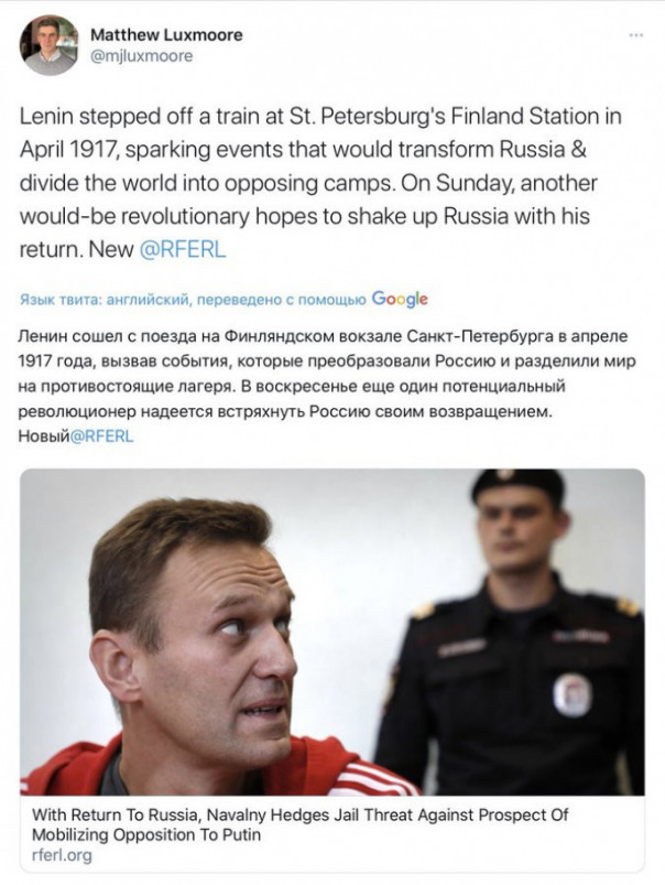 Московский корреспондент "Радио Свобода", сотрудник британского Чатем-Хауса (Королевский институт международных отношений) Мэтью Луксмур: "Ленин сошёл с поезда на Финляндском вокзале Санкт-Петербурга в апреле 1917 года, вызвав события, которые преобразовали Россию и разделили мир на противостоящие лагеря. В воскресенье ещё один потенциальный революционер надеется встряхнуть Россию своим возвращением. Новый".