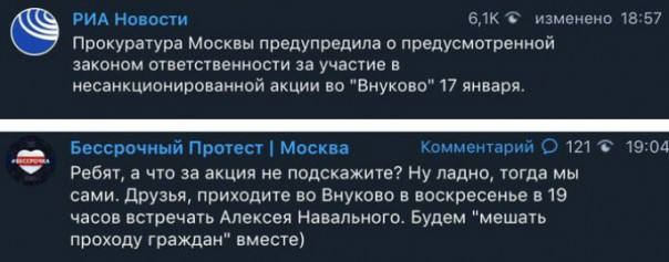 Майданный Telegram-канал RUSSIANEXT (филиал польского Telegram-канала NEXTA; составная часть информационно-диверсионной спецоперации, за которой стоят спецслужбы США, Великобритании и Германии): "Альтернатива у нас только одна, это объединение всей оппозиции, с целью демонтажа режима. Все те, кто занимается войной с другими оппозиционными деятелями, по факту занимаются саботажем на потеху злобного карлика. 17.01.2021, Внуково, 19:20".