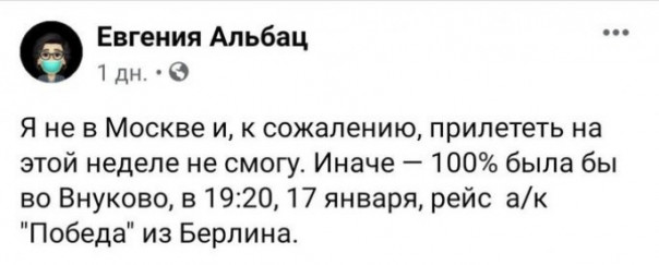 Муниципальный депутат Тимирязевского района и сооснователь проекта "Школа местного самоуправления" (действует на средства антироссийских подрывных структур вроде немецкого Фонда Фридриха Наумана, американской "Свободной России", польской НКО Fundacją Centrum Stosunków Międzynarodowych, а также "Открытой России" Михаила Ходорковского) Юлия Галямина: "Я сейчас болею, но до воскресенья надеюсь поправиться. И я обязательно постараюсь поехать во Внуково. Буду встречать там Алексея Навального. Очень рассчитываю, что нас там будет много. Противостояние с бандитами у власти достигло такой точки, после которой никакие разногласия между лидерами оппозиции уже нельзя оправдать. Пришло время объединять усилия и призывать к этому своих коллег и соратников. Поэтому встретимся в аэропорту. 17 января, Внуково".