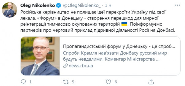 Говоря о фантастике, Николенко повторил слова своего шефа – министра иностранных дел Украины Дмитрия Кулебы. Именно в таких выражениях Кулеба прокомментировал донецкий форум.