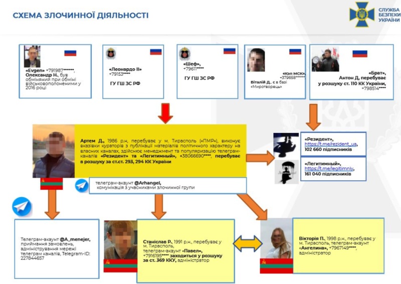 В ходе пресс-конференции в управлении СБУ Харьковской области были озвучены эти Telegram-каналы: «Легитимный», «Резидент», «Картель», «Сплетница», «Черний квартал», «Политический расклад», «Нетипичное Запорожье», «Тремпель Харьков», «Одесский фраер», «Днепр live», «Николаев live», «Херсон live»».