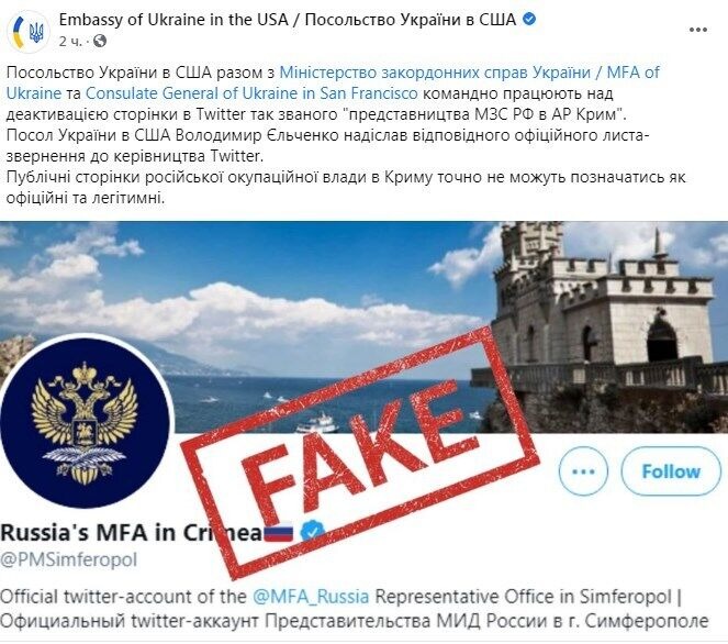 В посольстве добавили, что «публичные страницы российской оккупационной власти в Крыму не могут помечаться как официальные и легитимные».