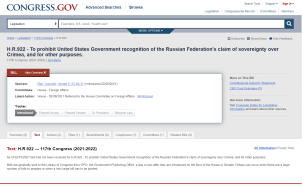 Соответствующий проект закона под номером H.R.922 опубликован на сайте Конгресса США. Документ уже направили на рассмотрение комитета Палаты представителей по иностранным делам.