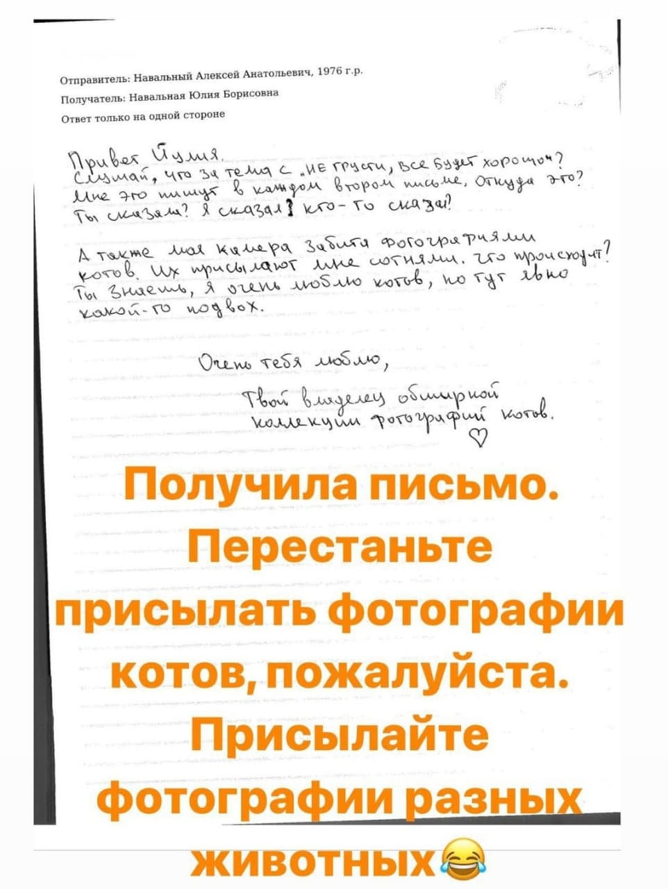 Жена Навального Юлия выложила письмо, в котором он недоумевает, почему ему сотнями приходят мемы с котами: