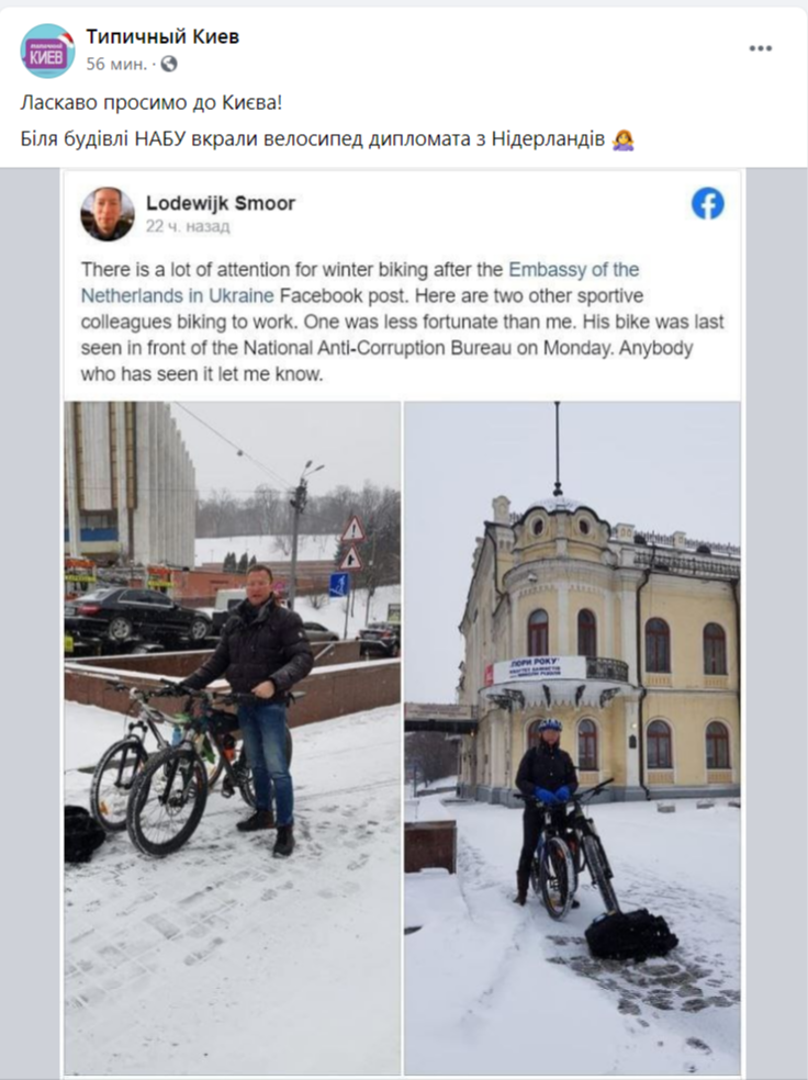 У дипломата из Нидерландов в Киеве средь бела дня украли велосипед. Велосипед последний раз был замечен у здания Национального антикоррупционного бюро Украины (НАБУ).