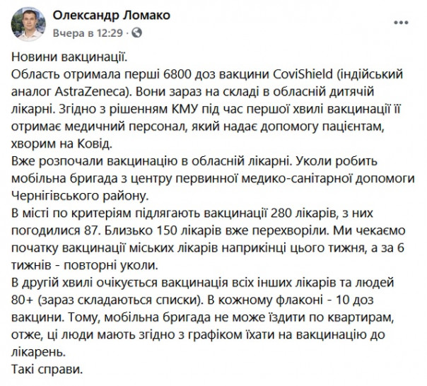«В городе по критериям подлежат вакцинации 280 врачей, из них согласились 87. Около 150 врачей уже переболели», — написал секретарь Черниговского горсовета Александр Ломако в Facebook.