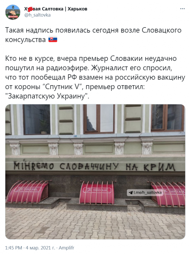 «Акция» очевидно была посвящена словам премьер-министра этой страна Игоря Матовича, сообщившего, что с Россией за вакцину «Спутник V» его правительство рассчиталось «Закарпатской Украиной».