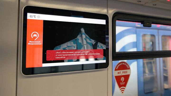 В московском метро транслируют видео с закрытой презентации новейшего российского истребителя МиГ-35. Продолжительность ролика – полторы минуты. Из него можно узнать, например, технические характеристики боевого самолета, сообщает корпорация "МиГ".