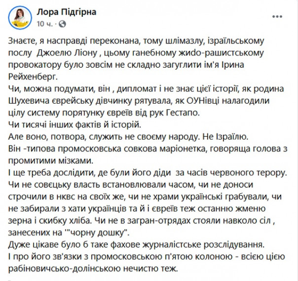«Знаете, я на самом деле убеждена, тому шлимазлу, израильскому послу Джоэлю Лиону, этому позорному *идo-рашисткому провокатору было совсем не сложно загуглить имя Ирина Рейхенберг. Или можно подумать, он дипломат и не знает этой истории, как семья Шухевича еврейскую девочку спасала, как ОУНовцы наладили целую систему спасения евреев от рук гестапо. Или тысячи других фактов и историй. Но оно, чудовище, служит не своему народу. Не Израилю. Он — типичный промосковская совковая марионетка, говорящая голова с промытыми мозгами. И ещё надо исследовать, где были его деды во времена красного террора», — возмущается она.