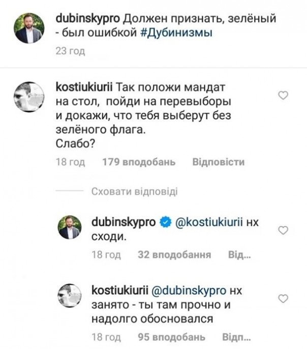 Дубинский ответил на это: «На**й сходи». Костюк поддержал: «На**й занято — ты там прочно и надолго обосновался».