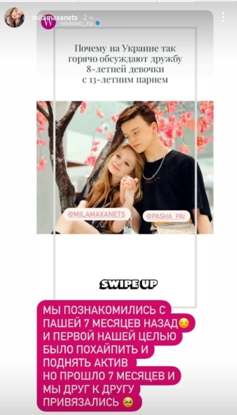 Напомним, в середине марта 8-летняя модель Милана Маханец и 13-летний блогер Паша Пэл объявили себя парой. Девочка с одобрения мамы перебралась жить в квартиру своего избранника. В соцсетях они начали выкладывать совсем не детские истории.