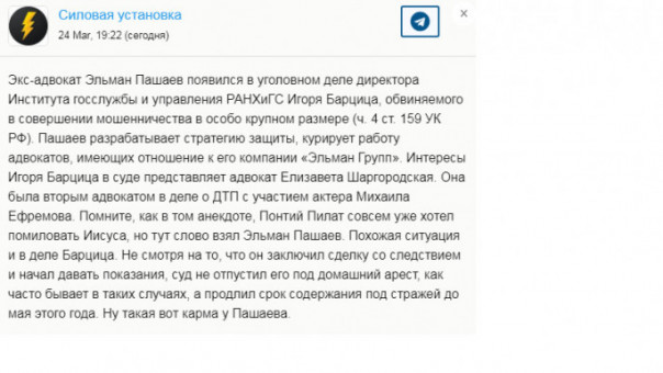 ТГ-канал "Силовая установка" сообщает 24 марта: "Экс-адвокат Эльман Пашаев появился в уголовном деле директора Института госслужбы и управления РАНХиГС Игоря Барцица, обвиняемого в совершении мошенничества в особо крупном размере (ч. 4 ст. 159 УК РФ). Пашаев разрабатывает стратегию защиты, курирует работу адвокатов, имеющих отношение к его компании «Эльман Групп». Интересы Игоря Барцица в суде представляет адвокат Елизавета Шаргородская. Она была вторым адвокатом в деле о ДТП с участием актёра Михаила Ефремова. Помните, как в том анекдоте, Понтий Пилат совсем уже хотел помиловать Иисуса, но тут слово взял Эльман Пашаев. Похожая ситуация и в деле Барцица. Несмотря на то, что он заключил сделку со следствием и начал давать показания, суд не отпустил его под домашний арест, как часто бывает в таких случаях, а продлил срок содержания под стражей до мая этого года. Ну такая вот карма у Пашаева".